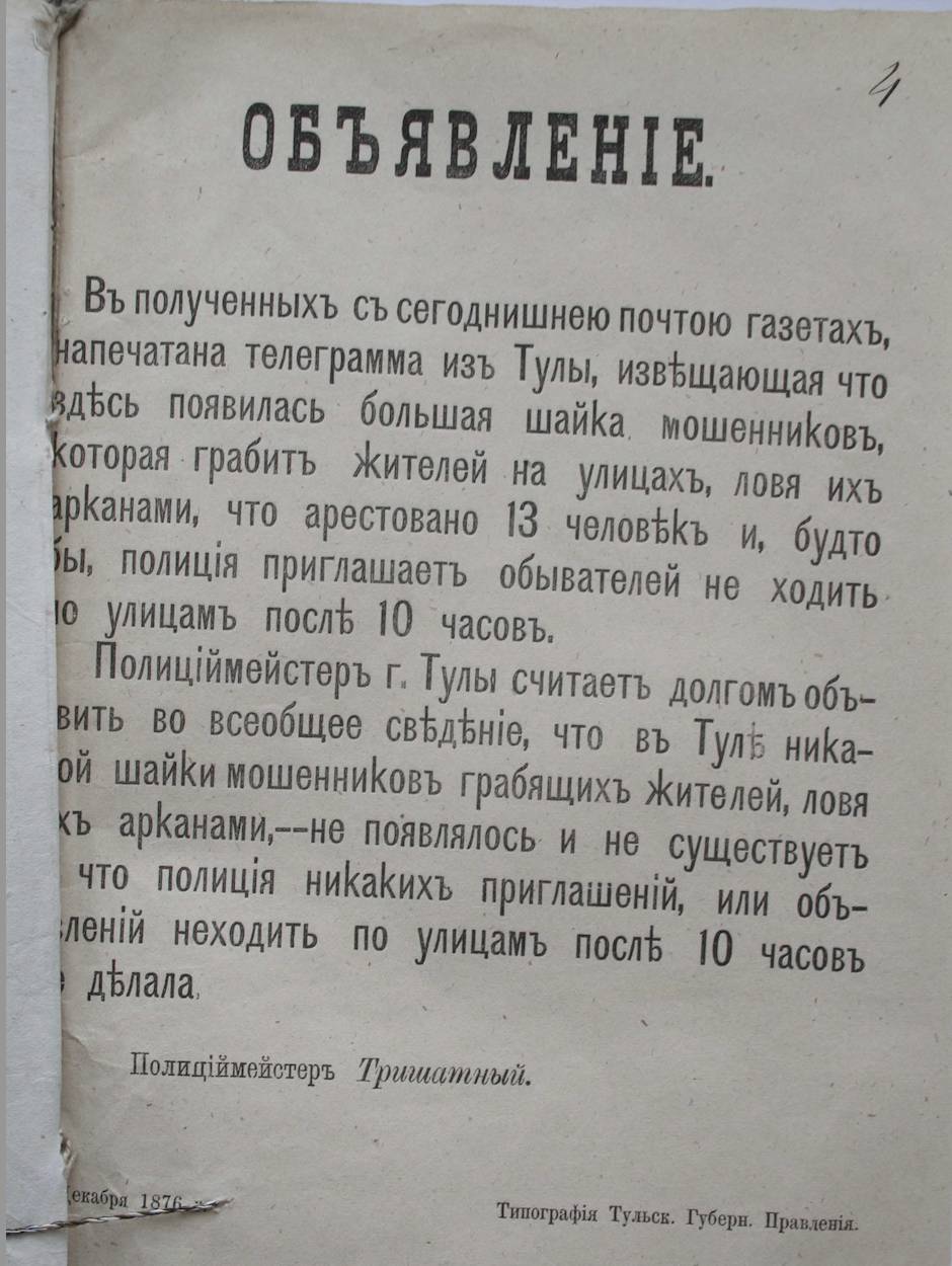 Полицмейстер г. Тулы считает долгом объявить во всеобщее сведение, что в Туле никакой шайки мошенников грабящих жителей, ловя их арканами, – не появлялось и не существует, и что полиция никаких приглашений или объявлений неходить по улицам после 10 часов не делала.
