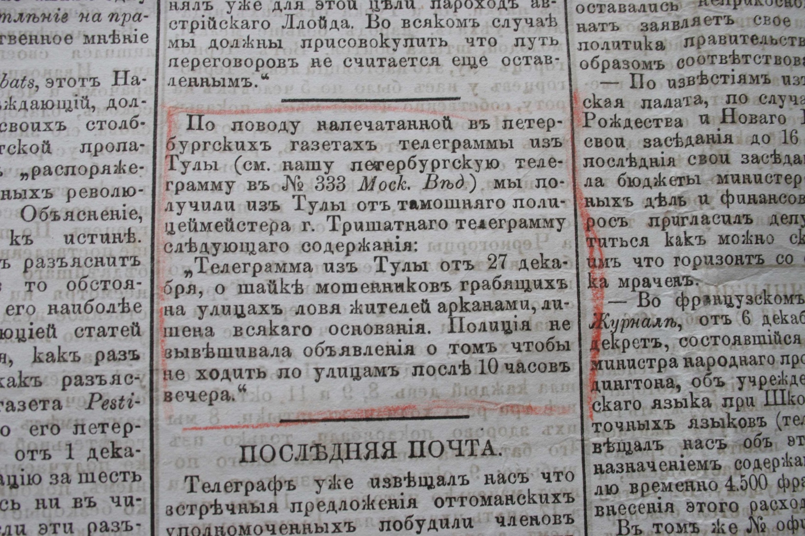 «Телеграмма из Тулы от 27 декабря, о шайке мошенников грабящих на улицах ловя арканами, лишена всякого основания. Полиция не вывешивала объявления о том чтобы не ходить по улицам после 10 часов вечера».