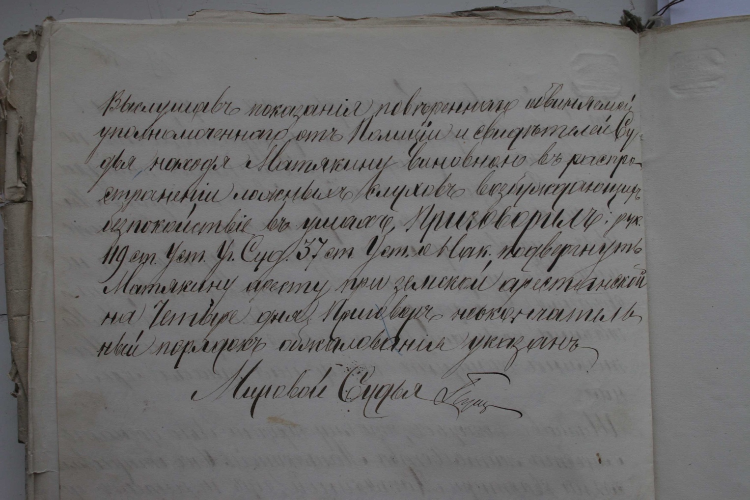 «Судья, находя допрос свидетелей излишним и обвинение Баташева в мошенничестве доказанным, приговорил: руководствуясь 119 статьей Уст. Уг. Суда и 173 ст. Уст. о нак. подвергнуть Баташева заключению в тюрьму на 2 месяца, а впредь пока приговор войдет в законную силу, содержать его в Земской арестантской, если не будет представлено залога или поручительства на сумму 100 рублей. Приговор неокончательный, порядок обжалования объявлен. Что сверху на четвертой странице написано: «Представленная решетка плотно вделываемая в самовар Баташева», то верно.