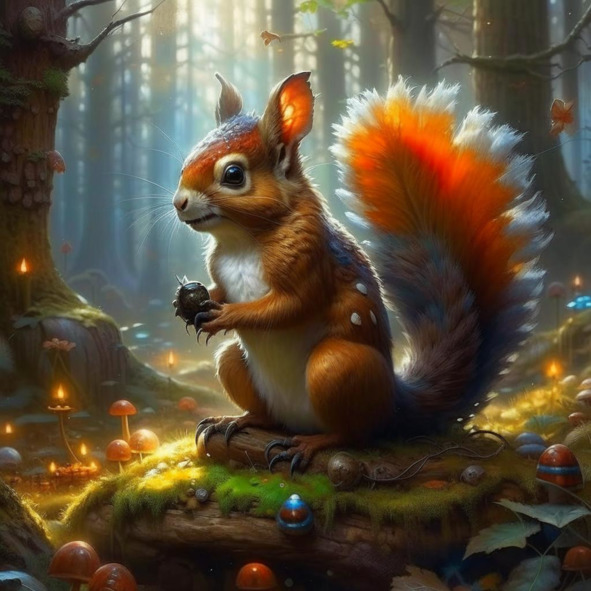 Давным-давно, в далекой-далекой стране, в сказочном лесу жила озорная маленькая белочка по имени Натти. Она любила исследовать заколдованный лес и по-доброму подшучивать над своими друзьями-животными. Однажды солнечным днем, когда Натти бегала по деревьям, она наткнулась на говорящий гриб по имени Шруми. Он рассказал Натти, что раньше был волшебным, но потерял свои магические силы и больше не мог исполнять желания. Натти была доброй белочкой и решила помочь Шруми. Она отправилась на поиски легендарной Мудрой Совы, чтоб спросить ее совета.