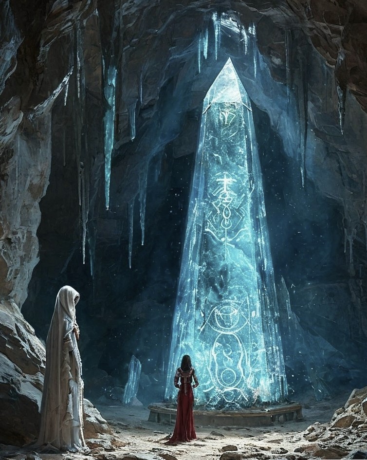 Пройдя в очередную арку, Сергей увидел ступени, уходящие глубоко вниз. Спустившись по ним, они вошли в просторный зал, украшенный резными колоннами и мраморными статуями. Но внимание Сергея привлекло другое. Под высокими сводами в центре зала прямо из пола вырастал гигантский прозрачный кристалл.