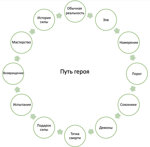 Джозеф Кэмпбелл в книге «Тысячеликий герой» проанализировал известные мифы древности и пришёл к выводу, что все они имеют одинаковую структуру – «путь героя», который включает в себя семнадцать шагов. Обычно его упрощают до двенадцати.