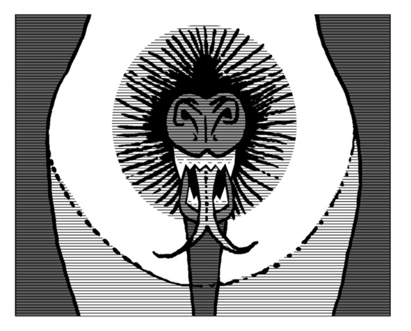 Через тьму и голубые всполохи света я опустился на ночной луг, покрытый густой травой, мокрой от росы. Вокруг ничего не было, как, впрочем, и неба надо мной – ни звезд, ни луны – хотя мертвенно-холодный свет освещал пространство вокруг меня широким кругом, на границе которого клубилась непроглядная чернота. Источником этого света был я сам и, куда бы ни двигался, он освещал мне дорогу. Обернувшись, я увидел позади себя на самом краю тьмы каменный алтарь, покрытый загадочными знаками, и меня неудержимо потянуло к нему. По мере того как я приближался, из черноты выступали каменные столбы вокруг громадного дуба позади него, в стволе которого чернело дупло в форме двери, обложенное по краям серебряными пластинами с руническими письменами. У подножия дерева росли ядовитые цветы алконита вертикалями иссиня-черных соцветий, а само оно было увито плотной порослью плюща, круглые листья которого отчетливо читались на фоне его бугристой кожи. В глубине огромного в рост человека дупла тлели как будто две красные искорки, глядя на которые, мной овладела робость. «Кто там?» – мелькнуло у меня в мыслях, но во сне и говорить не надо, так как в ответ я ясно услышал: «Твоя цадекес, твой масляный субботний светильник», – а два огненных уголька приблизились, и вот уже я видел перед собой горящие красным в их необоримой глубине черные глаза на звериной морде выступающей мне навстречу женщины, но какого же чудовищного вида: лошадиная голова вырастала из собачьего туловища с отвисшими грудями взамен обычных сосцов, а вместо гениталий зияла мохнатая морда льва, сквозь клыки которой высовывался бледно-розовый раздвоенный на конце язык, с которого капала слюна; руки человеческие, а ноги заканчивались птичьими лапами. «Так вот почему у меня была расцарапанная спина, – тут же понял, вспомнив, как она обвивала меня ногами, – значит это не кошка, а птичьи лапки. Значит, я каждый раз встречался с нею в таком обличье? Кто же ее такую полюбит?» «По-любит, любит, л-ю-ю-ю-б-и-т» – прогремело эхом, да так громко, что дрожали листья на дубе, а трава обиженно звенела осыпающейся росой. Она засмеялась в ответ, а я подумал, что эти нечеловеческие глаза, такие неуместные на том ее лице, теперь на своем месте. «Вместе, вместе», – эхом прогремело в ответ, и вот уже она обнимает меня, а я ее. Оттащив меня к алтарю и, словно угадав мою мысль о том, как я буду с ней совокупляться, если у нее там львиная пасть, разворачивается ко мне спиной, залезает на камень и, встав по-собачьи на четвереньки, раздвигает, не оглядываясь, руками ягодицы, бесстыдно обнажая зажмурившийся глазок ануса, приглашая отведать ее. Я пугаюсь, но не того, что мне предстоит, а что даже сейчас эрекция мне не изменяет. Я овладеваю ею и понимаю отчетливо, что то, что я сейчас с ней проделываю – это любовный акт со знаком минус: осквернение самого понятия «любовь», – используя другу друга, мы кощунствуем. И это меня подстегивает продолжать до тех пор, пока не извергаюсь в нее под радостный рев лошади и льва. А затем начинается уже совсем черт знает что. Она встает в центре алтаря и, согнувшись пополам, начинает испражнять из своей задницы младенцев одного за другим, не переставая. Они падают ей под ноги с плачем до тех пор, пока я не пытаюсь закричать «Остановись», но вместо этого громыхает откуда-то сверху грозный голос «Станови