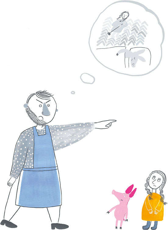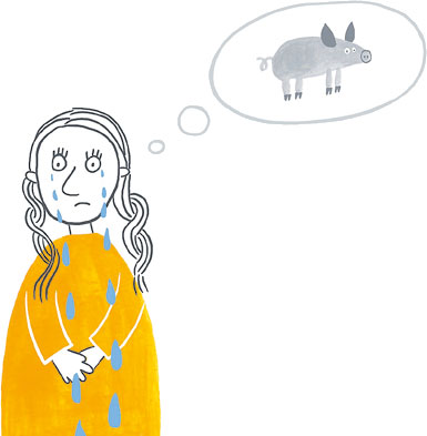 Раньше в доме мельника никто не плакал. По крайней мере, при Бетте ни одна душа своей печали не показывала. Поэтому девочка очень удивилась и даже испугалась, когда её поросёнок вдруг начал тоненько визжать, а из глаз его брызнули слёзы. Уж не рассыплется ли он на тряпочки, как старая игрушечная свинка? Но поросёнок оставался целым, и девочка обняла его, положила в свою кроватку, спела колыбельную, а ко-гда Фред заснул, Бетта взяла веник и стала подметать в комнате.
