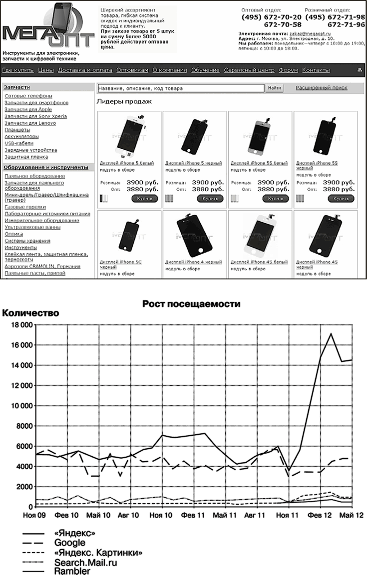 Пример 4. Сайт компании, занимающейся организацией лечения в Германии. Мы взяли его, что называется, с нуля. На рис. 1.4 вы видите, как в течение года планомерно росла посещаемость веб-страниц из разных поисковых систем: на сайт приходят представители целевой аудитории, заинтересованные в предлагаемых компанией услугах. В начале их работы звонков и обращений с сайта не было вообще. Сегодня они получают около двух десятков обращений в день, что для сайта подобной тематики хороший результат.