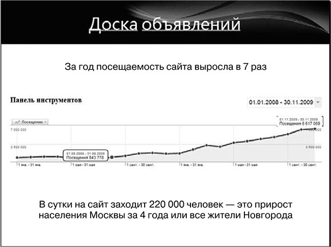 Пример 5. Мы занимались продвижением одной достаточно крупной доски объявлений. В течение года ее посещаемость выросла более чем в десять раз: если посмотреть статистику конца 2012 года и сравнить с показателями на момент начала работы оптимизаторов, можно увидеть и рост посещаемости, и приток большого объема целевого трафика (рис. 1.5).