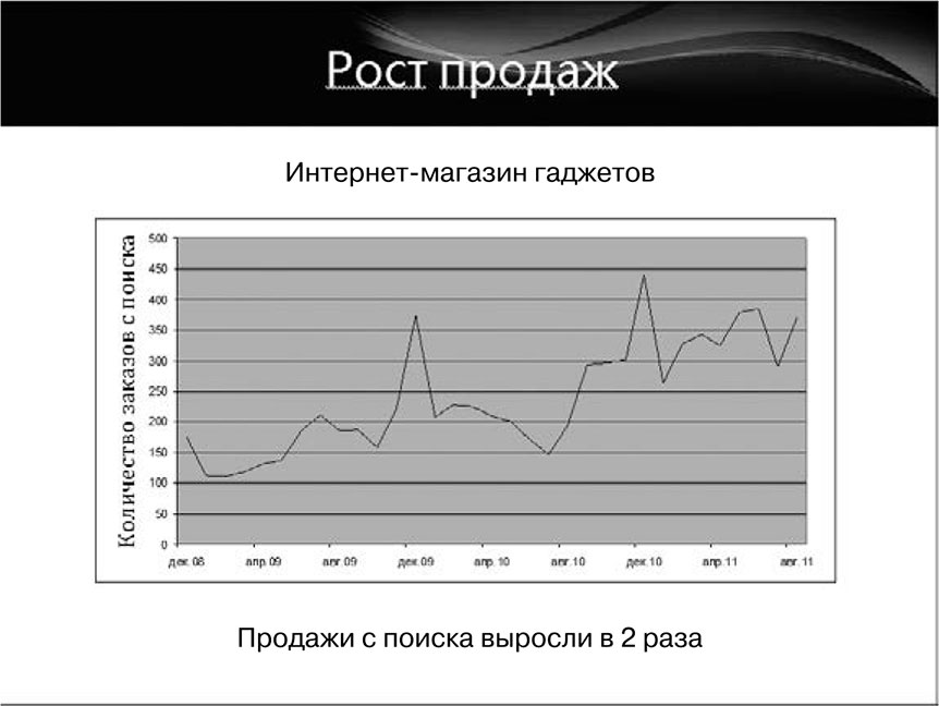 Во-вторых, для привлечения на сайт большого объема целевого трафика (обязательно целевого). Эта категория клиентов стремится к тому, чтобы оптимизаторская компания или частный оптимизатор привлекли на сайт сотни, тысячи, а иногда и десятки тысяч посетителей, являющихся потенциальными покупателями компании клиента. Если вдуматься, то для бизнеса понятия «высокие позиции» и «большой объем трафика» абстрактны. Главная цель предпринимателей в этом контексте – продажи, приносящие реальную прибыль. Это и есть отдача от мероприятий SEO.