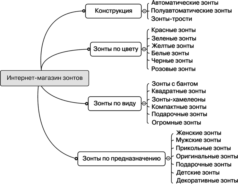 • Построение структуры сайта. Если у вас собрано маленькое ядро запросов, получается такая же убогая структура (рис. 1.9). Как следствие – низкие позиции, небольшой трафик и недовольные клиенты. Хороший сайт всегда имеет логичную развернутую структуру (рис. 1.10).
