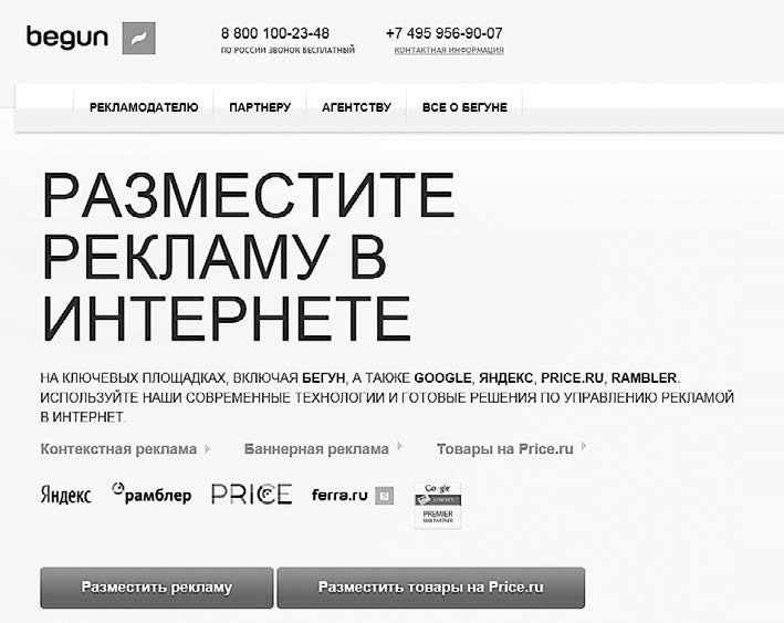 «Бегун» – запущенная в 2002 году «Рамблером» российская служба контекстной рекламы на площадках Рунета, основанная на выделении ключевых слов (рис. 4.2). К особенностям этого сервиса можно отнести: