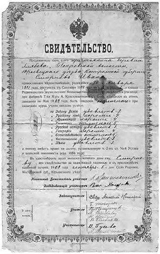 Свидетельство об окончании Иваном Смирновым Родниковского двухклассного училища при фабрике Товарищества мануфактур А. Красильщиковой с сыновьями. 1909 г.
