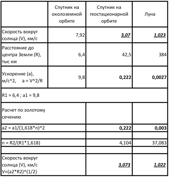 Как можно видеть наблюдаемая линейная скорость перемещения Луны вокруг Земли равна расчетной по методу золотого сечения. При этом массой Луны нельзя пренебрегать, в отличии от массы искусственных спутников. Тем не менее Луна также дрейфует в течении изначальной воды, которое было образованно водоворотом Земли, при этом явно оказывая гравитационное влияние на Землю.