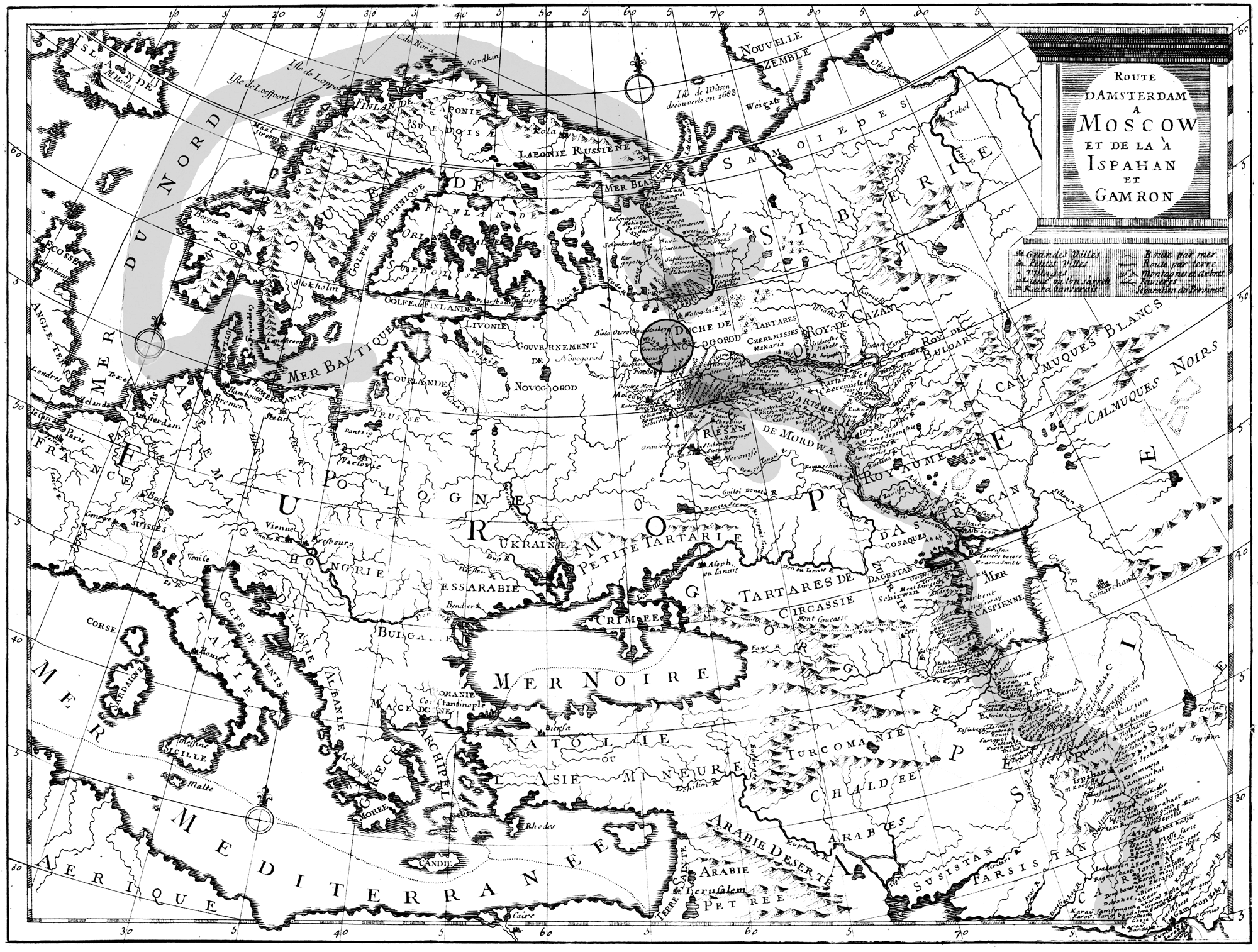 Рис. 15. Карта Европы и западной Азии с указанием поселений вдоль старых торговых путей. Амстердам, начало XVIII века. Хранится в Государственном историческом музее (Москва) под номером ГО-5062. Мы отметили на этой карте Северно-Двинский и Волжский торговые пути, а также место их схождения на Молжской ярмарке в окрестностях Ярославля.
