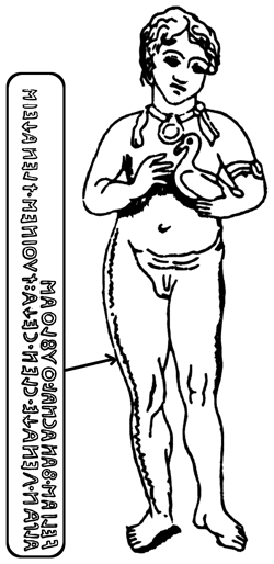 6.12.2. Мальчик с гусемПриведем еще один пример «нечитаемой» этрусской надписи, прочтенной Воланским, см. рис. 11. Воланский пишет: «Фигура … изображает нагого гетского мальчика с гусем в руках. Эта фигура найдена в 1746 году в тосканских владениях … Янссен в росписи этрусских надписей опубликовал ее под номером 33. В течение 100 лет … очень много говорили об этой статуйке … но ни один не сообщил нам достаточного объяснения» (страница 184).