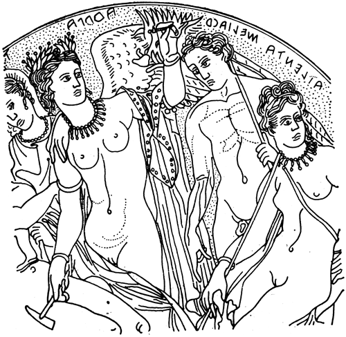 В заключение приведем еще один любопытный пример этусской надписи. На рис. 13 изображена прорисовка древнего этруского бронзового зеркала. Девушка с крыльями (ангел) прибивает к стене голову кабана над головой молодого человека. С другой стороны от него сидит еще одна девушка. Над их головами надписаны имена: АТЛЕНТА, МЕЛИАСД, АДДГА (ATLENTA, MIELIACD, ADDГA). Направление письма справа налево. Само изображение выглядит вольным и даже распущенным. Но надо понимать, что привычная нам строгость нравов возникла далеко не сразу. Этруски, жившие в Италии XIV–XV веков, этой строгости еще не знали. Попав на юг из северных русских областей, и живя среди покоренного местного населения, завоеватели расслабились, увлеклись философией, искусствами, развлечениями. Очень многого достигли в науках и искусствах. Но, при этом, разучились хорошо воевать.