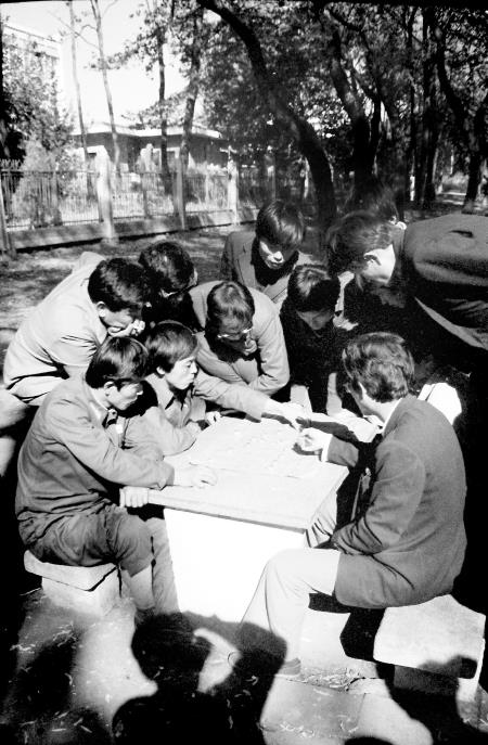 Бродя по набережной реки Потхонган, натыкаюсь на группу пхеньянцев, играющих в шахматы «чанги». Зрители вплотную облепили каменные столики и скамейки. На столе – квадрат серо-желтой оберточной бумаги, расчерченный в крупную клетку.