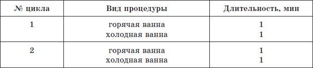 Горячую и холодную ванну принимают попеременно. Для здоровых людей температура горячей ванны 42–43 С, а температура холодной ванны – 14–15 С. Каждая ванна длится одну минуту, ванны чередуются. Минимальная серия ванн состоит из 11 циклов, но иногда курс может состоять даже из 61 цикла.