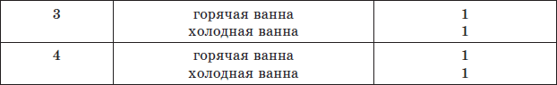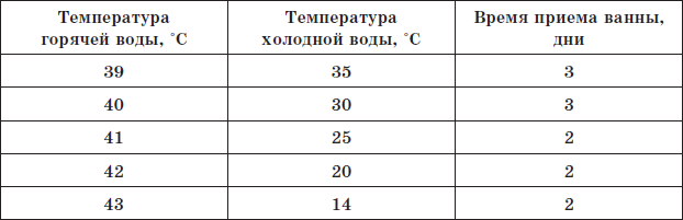 Методика приема ванн с погружением до паха следующая: вначале нужно принять обычную горячую ванну для всего тела, затем тщательно вытереться и приступить к контрастным ваннам (график приема ванн см. в таблице 6).