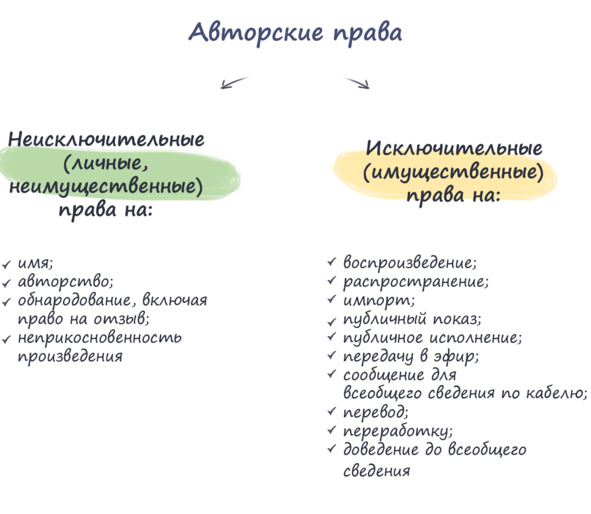 Чтобы её распутать, вернёмся к авторству. Автор – не просто гордое звание, чтобы впечатлить сына маминой подруги. Авторство подразумевает наличие целого ряда прав. Их можно разделить на две большие группы.