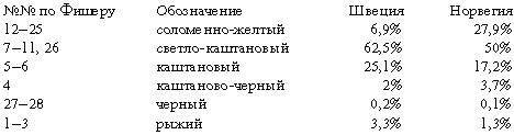 Шведских призывников обследовали на предмет цвета волос посредством локальной шкалы, которая позднее была скоррелирована с фишеровским стандартом (Лундборг-Линдерс, стр. 10). Сравнение между шведскими и норвежскими результатами было произведено рекомбинацией общей норвежской серии согласно шведскому делению на группы. Различие в количестве рыжих волос, несомненно, обусловлено различиями стандартов, как ранее заявил Конитцер (Conitzer, H., ZFMA, vol. 19, 1931, pp. 83–147.)