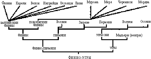 Рис. 31. Лингвистические взаимосвязи финно-угров. По Kajava, Y., EA #8, #9, 1922, pp. 353–358.