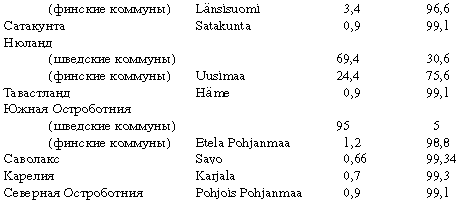 [Закрыть]. Округа, как на шведском, так и на финском языках, носят свои имена и содержат пропорции финского и шведского населения, как показано в таблице.