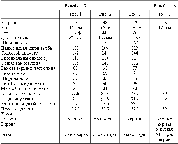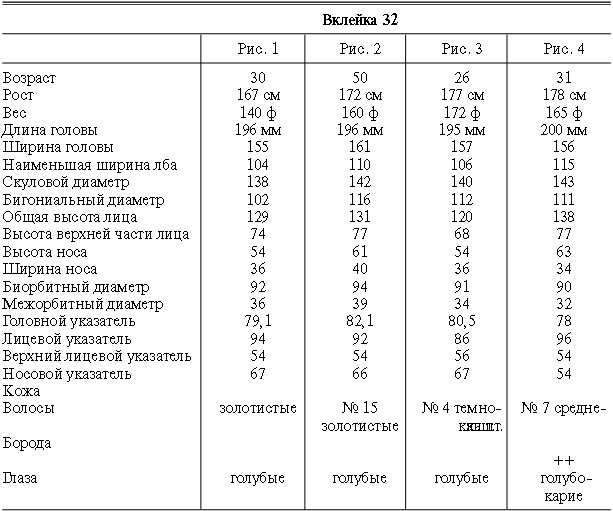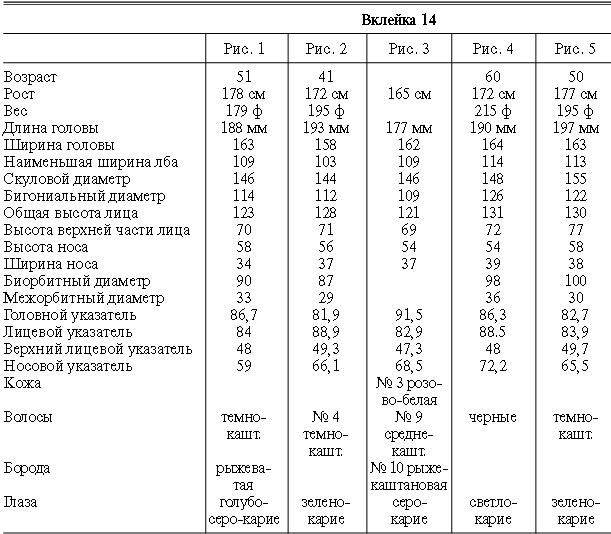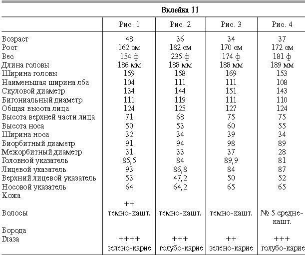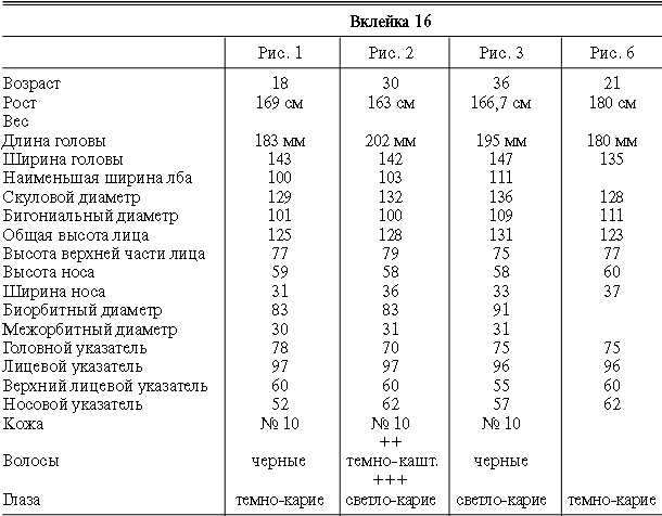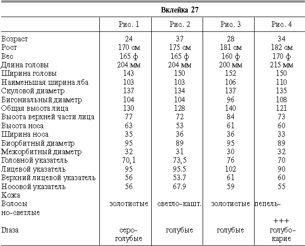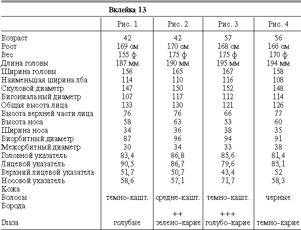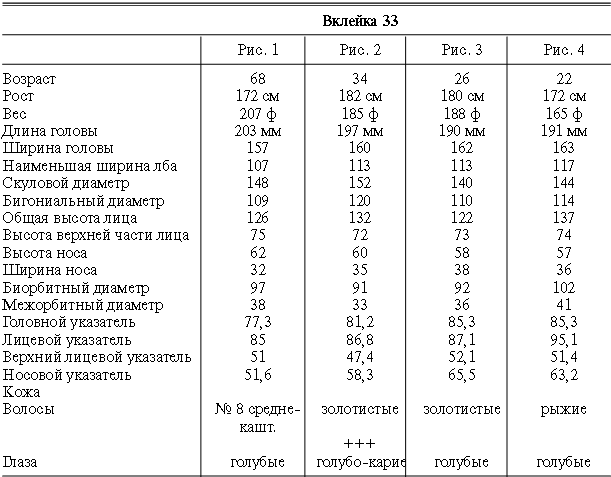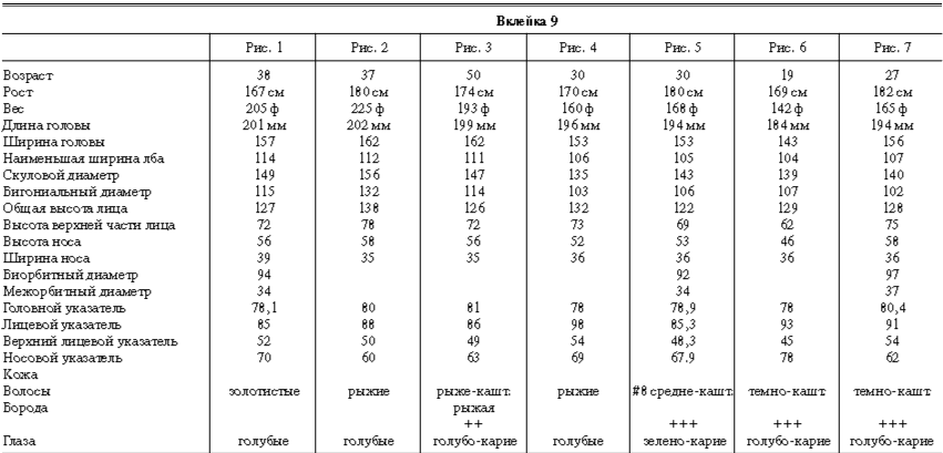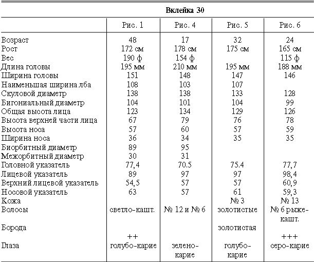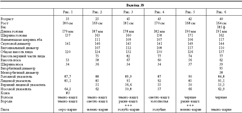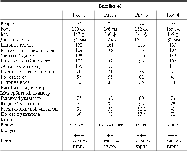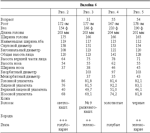 Эти таблицы дают описание главных антропологических черт большинства примеров, показанных в вышеописанных вклейках. В немногих случаях, особенно когда фотографии взяты из внешних источников, подобные данные недоступны. Рост измерен в сантиметрах, вес в фунтах, размеры головы и лица в миллиметрах. Что касается цвета глаз, использование знаков «плюс» (++, +++) над одним из элементов в смешанной радужной оболочке указывает на относительную значимость рассматриваемых элементов глаза. Например, голубо+++-карий указывает на радужную оболочку, почти полностью голубую; зелено-карий++ – на оболочку, кажущуюся более карей, чем зеленой.