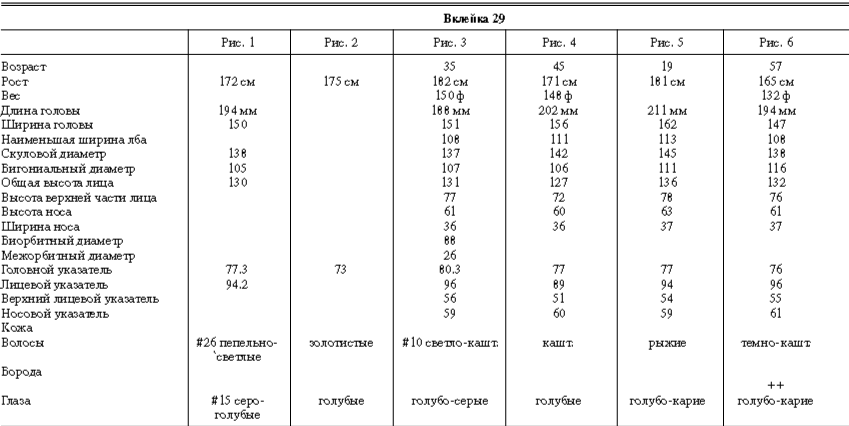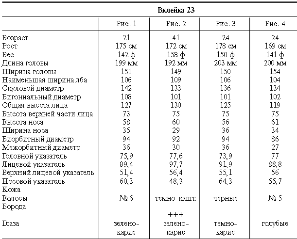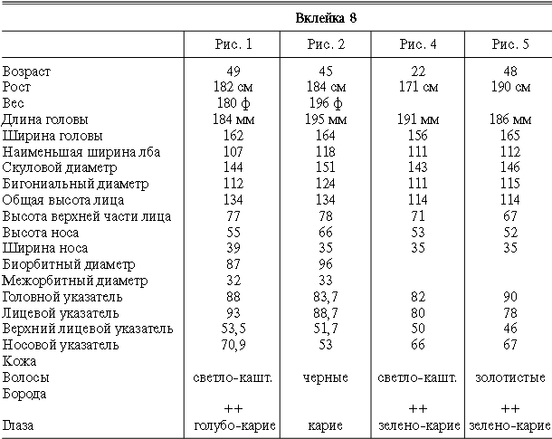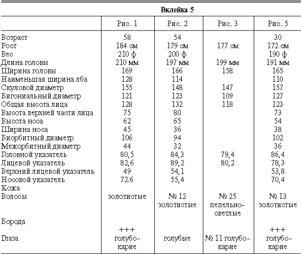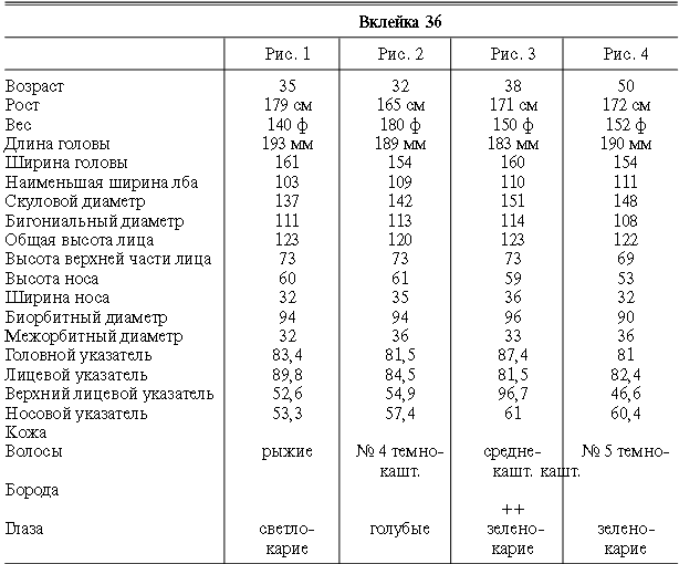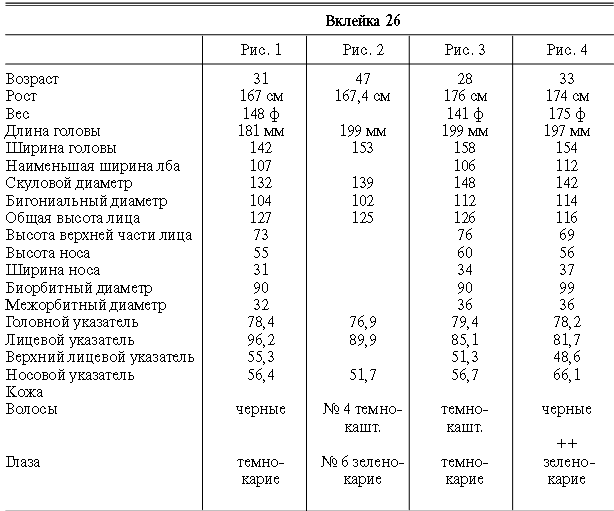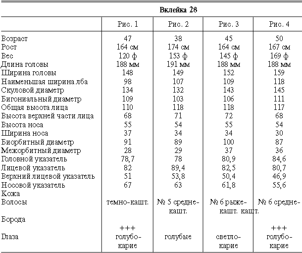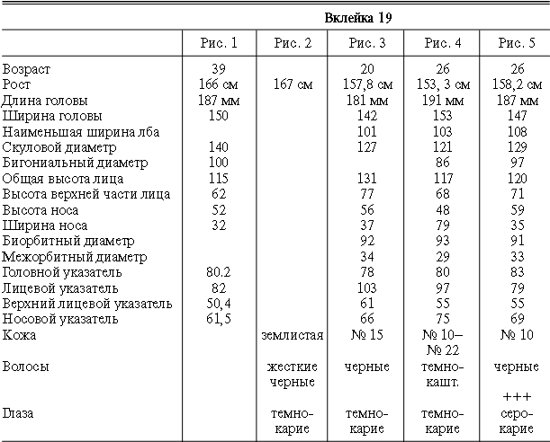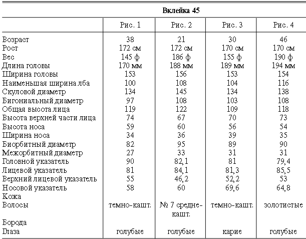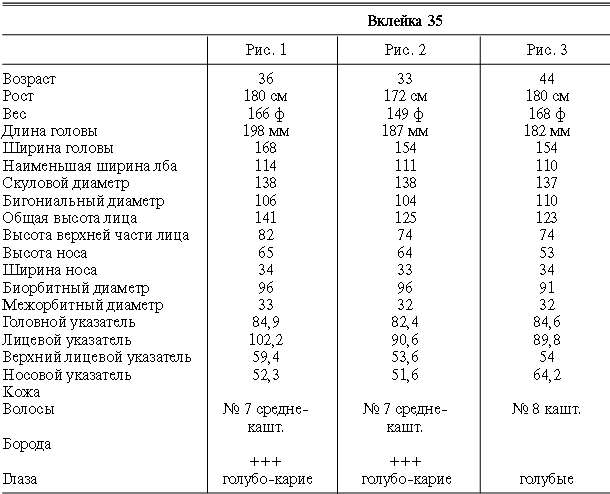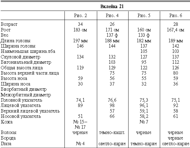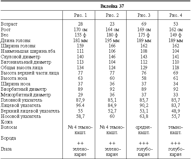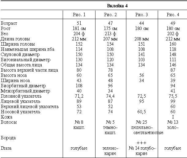 Эти таблицы дают описание главных антропологических черт большинства примеров, показанных в вышеописанных вклейках. В немногих случаях, особенно когда фотографии взяты из внешних источников, подобные данные недоступны. Рост измерен в сантиметрах, вес в фунтах, размеры головы и лица в миллиметрах. Что касается цвета глаз, использование знаков «плюс» (++, +++) над одним из элементов в смешанной радужной оболочке указывает на относительную значимость рассматриваемых элементов глаза. Например, голубо+++-карий указывает на радужную оболочку, почти полностью голубую; зелено-карий++ – на оболочку, кажущуюся более карей, чем зеленой.