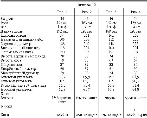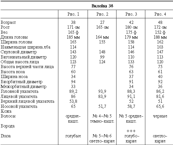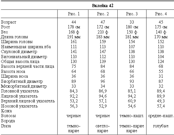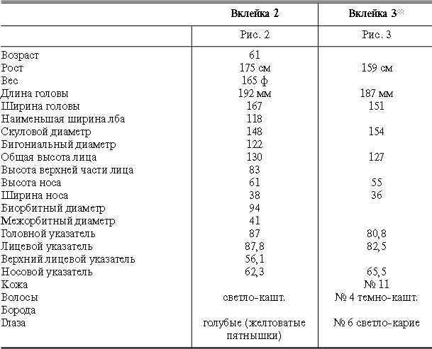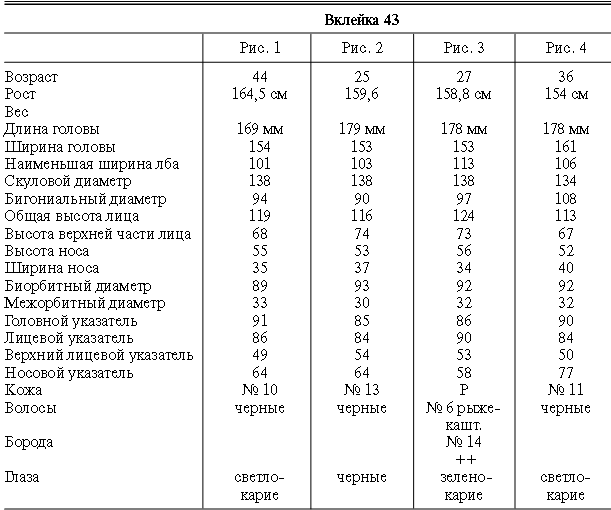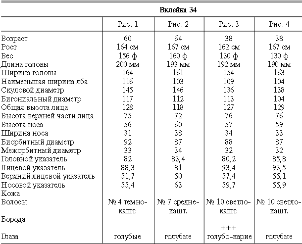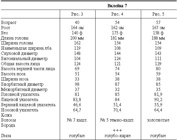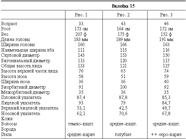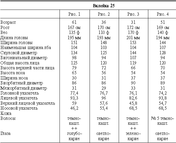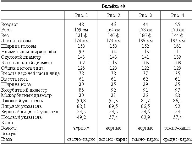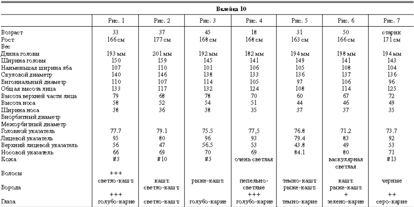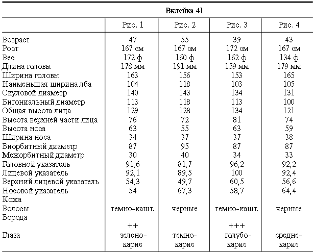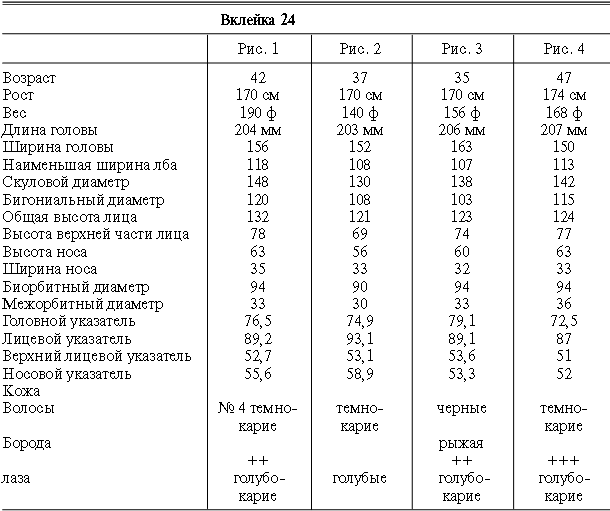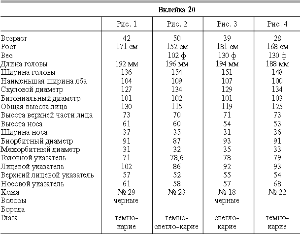 Эти таблицы дают описание главных антропологических черт большинства примеров, показанных в вышеописанных вклейках. В немногих случаях, особенно когда фотографии взяты из внешних источников, подобные данные недоступны. Рост измерен в сантиметрах, вес в фунтах, размеры головы и лица в миллиметрах. Что касается цвета глаз, использование знаков «плюс» (++, +++) над одним из элементов в смешанной радужной оболочке указывает на относительную значимость рассматриваемых элементов глаза. Например, голубо+++-карий указывает на радужную оболочку, почти полностью голубую; зелено-карий++ – на оболочку, кажущуюся более карей, чем зеленой.