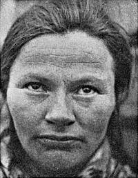 Рис. 4 (фото Мартина Лютера). Зачаточно монголоидные черты, обнаруживаемые у лопарей, обычно более ярко выражены у женщин, чем у мужчин. Эта обладающая такими чертами женщина из норвежских лопарей, кажется, воспроизводит распространенный в Центральной и Восточной Европе тип лица, известный как «славянский» или «восточнобалтийский». На самом деле в этих чертах нет ничего по-настоящему монголоидного; схожесть лишь отдаленная и относительная.