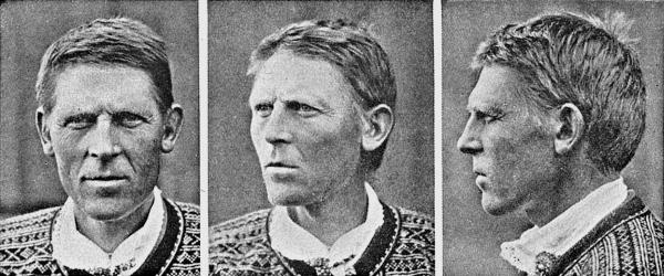 Рис. 3 (из Alette Schreiner, Anthropologische Lokaluntersuchungen in Norge; Valle, Halansdal, und Eidfjord. Oslo, 1930. № 113). Этот норвежец из изолированного горного поселения Валле в юго-западной Норвегии принадлежит к тому же базовому типу, что и два предыдущих индивида; однако его лицо и нижняя челюсть у́же; его волосы пепельно-светлые; заметна нордическая примесь.