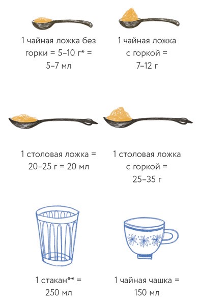 Если под рукой нет мерных ложек или кулинарных весов, можно взять простые столовые приборы и посуду. Измерения буду не такие точные, но – что поделать!