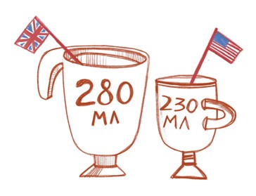 Самая большая чашка в Великобритании – около 280 мл, самая маленькая в США – 230 мл. Можно ориентироваться на среднее значение 250 мл. Но помните, что этот объем вмещает от 130 г (например, легкие овсяные хлопья) до 300 г (плотный мед).