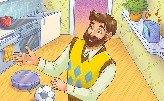 – Здравствуй, дядя Кузя. Я пыль вытер, игрушки собрал, посуду помыл – и так устал. Вот бы за меня какой-нибудь робот всё делал!