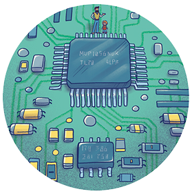 – Внутри современной стиральной машинки, Чевостик. Смотри, эта прямоугольная пластина – процессор, её мозг. В нём много-много маленьких преобразователей электрического сигнала. К ним крепятся провода, преобразователи передают электрические сигналы друг другу, одни включаются, другие выключаются. Последовательность таких включений-выключений и есть программа. Стоит тебе загрузить бельё, выбрать тип стирки и нажать на кнопку, процессор запускает программу: включает подачу воды и нагреватель, вращает барабан, открывает сливное отверстие и так далее.