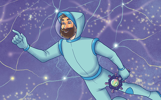 – Мы с тобой уменьшились так сильно, что рассматриваем мозг человека изнутри, Чевостик. Видишь, он состоит из миллиардов особых клеток – нейронов («звёзд» вокруг нас). Они связаны друг с другом отростками, словно люди, которые держатся за руки. Это нейронная сеть головного мозга. Заметь, что по отросткам бегут электрические сигналы, как поезда от станции к станции. Одни нейроны испускают сигналы, а другие – принимают их. Из огромного числа комбинаций таких сигналов складываются наши воспоминания, привычки, умения, действия.