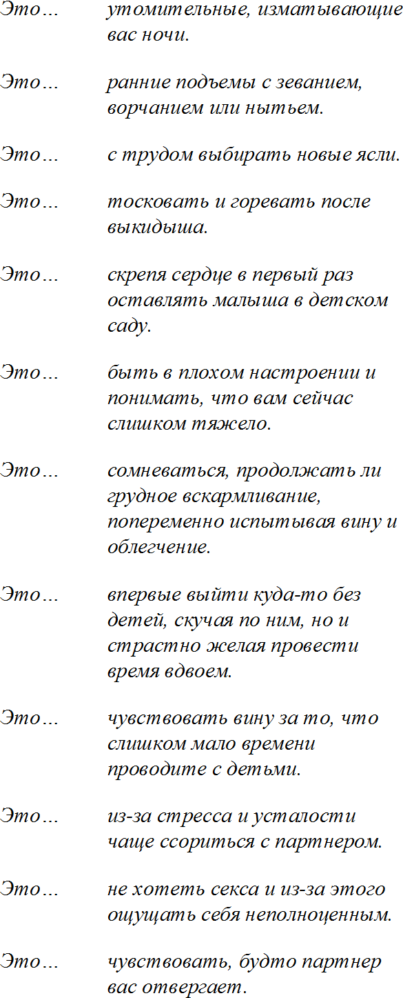 «Мы что, плохая пара? Может, просто не подходим друг другу? Разве мы не созданы друг для друга? Мы поторопились? Или недостаточно друг друга знаем? Было ли решение завести ребенка… непоправимой ошибкой?» (Ужас.) Эти вопросы месяцами бродили в закоулках моего сознания. Порой я их совершенно не замечала, а иногда они опять начинали меня беспокоить. Но я справлялась, в целом можно было жить. У нас случалось много радостных моментов, благодаря которым все эти вопросы на время отступали. Да, немного сложно, но мне казалось – не настолько плохо, чтобы что-то с этим делать. Сейчас я бы сказала, что на часах было 30 минут до полуночи.