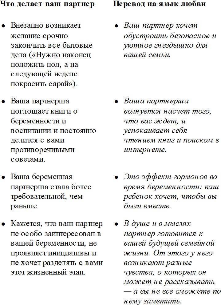 Вам нужно много всего успеть. Один может написать список дел и спросить другого, в чем тот хочет участвовать. Бывает, что кто-то из вас беспомощно наблюдает, как вторая половинка все берет в свои руки, и в такие моменты может показаться, что партнеру безразлично, что происходит с другим. Но иногда так проявляется забота и уважение или его неуверенность насчет всего происходящего. Во время беременности вы можете вовлекать партнера, задавая ему вопросы и создавая ощущение, что он тоже причастен и может сделать что-то полезное. Как он может вам помочь? Что для вас важно в подготовке? Партнер в свою очередь может сказать, в чем он хочет участвовать, или поделиться своими сомнениями на этот счет. Или он может включиться в процесс с уверенностью, что вы точно будете рады его вовлеченности и поддержке.