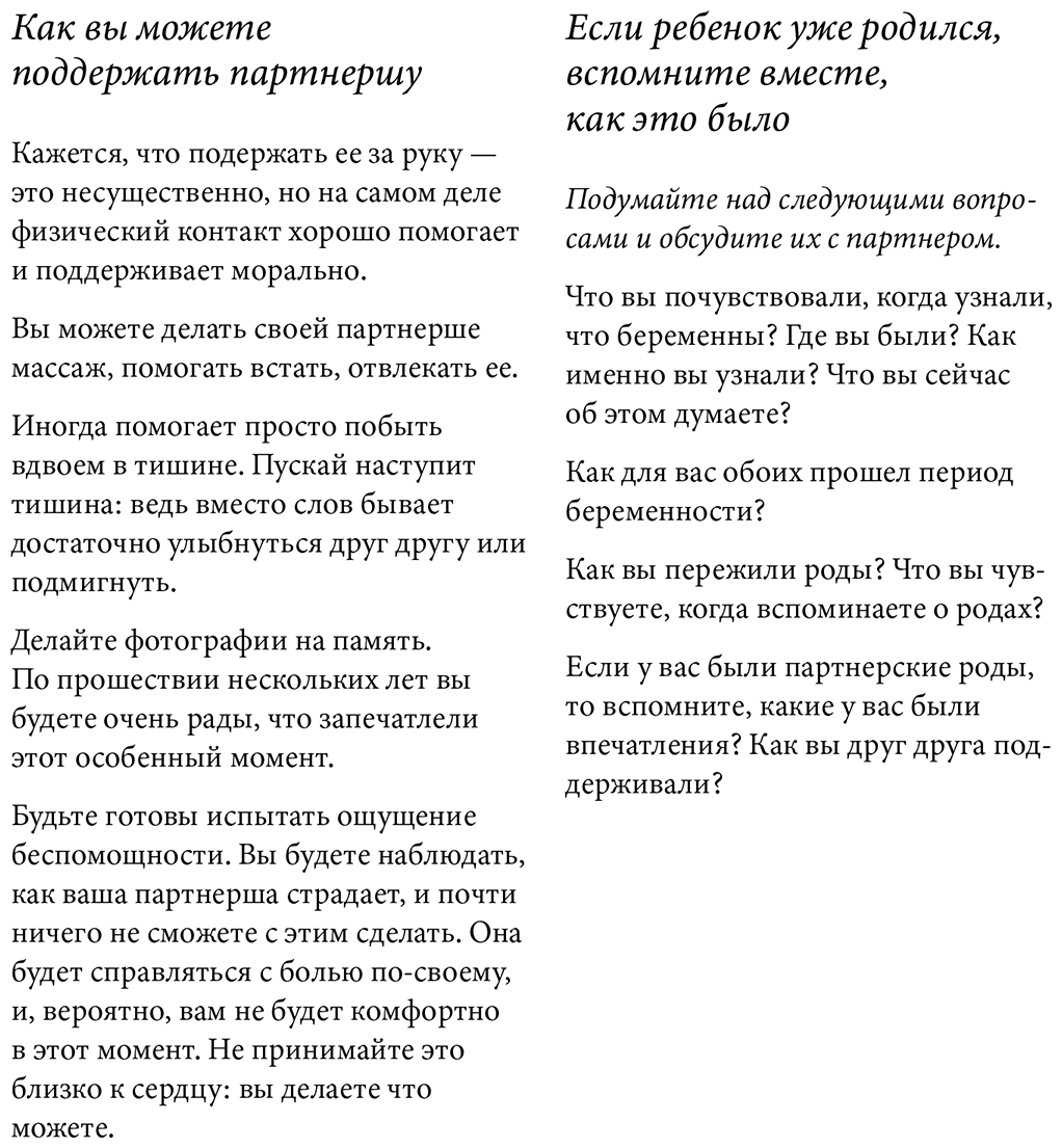 К счастью, времена изменились. Партнеров больше не выгоняют из родильного зала. Наоборот, они могут оказать своим женщинам необходимую поддержку. Если 100 лет назад в родильном зале нельзя было обнаружить ни одного супруга, то сейчас 91 % партнеров присутствуют на родах. И это замечательно! Исследования говорят нам, что если мужчина присутствует на родах, то у пары остаются более положительные впечатления о родах, к тому же такой опыт уменьшает риск конфликтов в отношениях.
