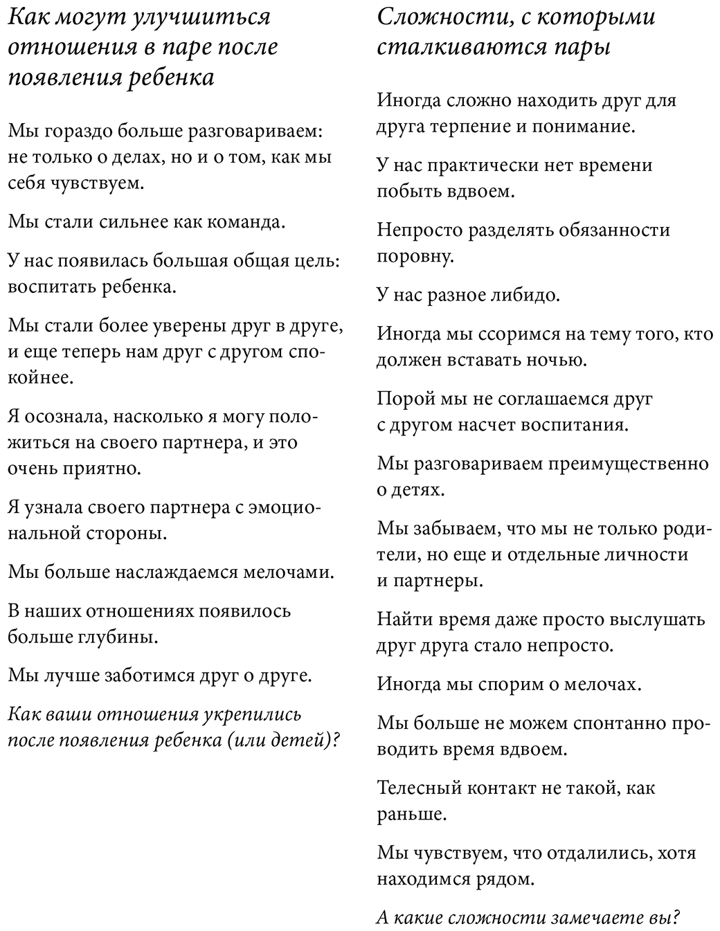 Готовы ли вы начать поиск того, что вас объединяет? Как вам прожить этот этап вместе? Каким образом вы можете вовлекать друг друга в процесс? Замечаете ли вы, что отдаляетесь друг от друга из-за множества дел? Каким образом вы можете наладить контакт с партнером?