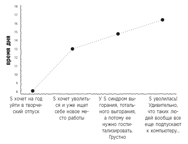 Начальница: «Вот как» (коллеги уже рассказали мне, как ты их задолбала. А потому все поспешили как можно скорее доделать свою работу, которой они в итоге не были по-настоящему довольны, – только лишь для того, чтобы ты, дедлайн-фетишистка, оставила их в покое).