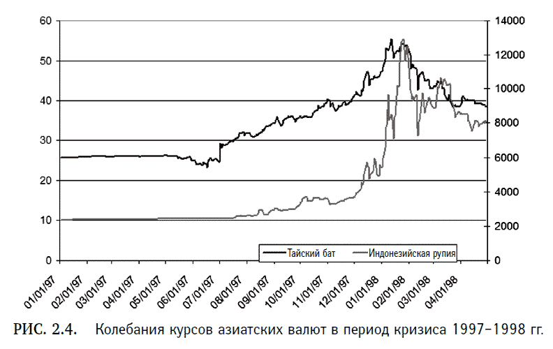 Относительно молодые экономики азиатских «тигров» 2 июля 1997 г. рухнули, как карточный домик, в чем проявилась взаимозависимость мировых рынков капитала и их влияние на валютные рынки. Причиной краха стали существенные факторы: непрозрачная система кредитования, раздутые торговые дефициты и неразвитые рынки капитала. Все вместе они привели к катастрофической ситуации: основные азиатские рынки оказались неспособны функционировать, а валюты с некогда высокими курсами значительно обесценились. На фондовых рынках отрицательные последствия кризиса были очевидны, но пострадали и валютные рынки.
