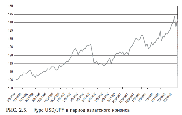 Валютный кризисПосле массовой продажи валют и неудачной интервенции экономики азиатских стран оказались разрушены и были неспособны нормально функционировать. Бат – национальная валюта Таиланда с некогда высоким курсом – обесценился на 48 %, а к концу 1997 г. эта цифра приближалась уже к 100 %. Но сильнее всех в результате кризиса пострадала индонезийская рупия, курс которой до обрушения был относительно стабильным. Национальная валюта Индонезии обесценилась на 228 % (первоначальный курс IDR/USD – 12,950). Девальвация тайского бата и индонезийской рупии показана на рис. 2.4. Что касается основных азиатских валют, то в 1997–1998 гг. курс японской иены к доллару США снизился приблизительно на 23 % (рис. 2.5).