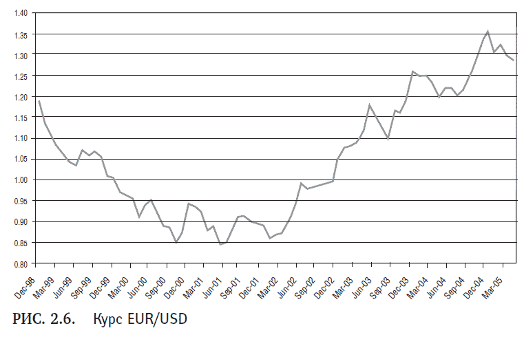 Кроме того, существуют некоторые сомнения в способности ЕЦБ выполнять функции центрального банка. Хотя целевая инфляция составляет чуть меньше 2 %, в 2000–2002 гг. темпы инфляции в Еврозоне превышали этот уровень. С 1999 по конец 2002 г. из-за недостатка доверия к евро (и Евросоюзу в целом) курс единой валюты снизился на 24 %: в январе 1999 г. один евро стоил приблизительно 1,15 долл., а в мае 2000 г. – 0,88 долл. В связи с этим в последние месяцы 2000 г. ЕЦБ пришлось провести валютную интервенцию. Но с тех пор ситуация сильно изменилась. Сегодня евро торгуется с премией относительно доллара США, и многие аналитики утверждают, что в будущем евро заменит доллар в качестве основной мировой валюты. (На рис. 2.6 изображен график курса евро начиная с его введения в 1999 г.)