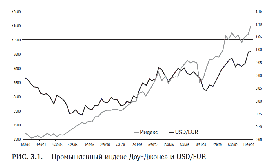 В последние годы возросла привлекательность фондовых рынков по сравнению с рынками ценных бумаг с фиксированным доходом. В начале 1990-х гг. отношение объема инвестиций в американские правительственные облигации к инвестициям в акции американских компаний составляло 10:1, сегодня оно равно 2:1. Как показано на рис. 3.1, в 1994–1999 гг. промышленный индекс Доу – Джонса имел высокую корреляцию с курсом доллара США (к немецкой марке). Кроме того, в 1991–1999 гг. индекс Доу – Джонса повысился на 300 %, а курс доллара за тот же период увеличился на 30 %. По этой причине валютные трейдеры внимательно следили за мировыми фондовыми рынками, чтобы прогнозировать на краткосрочную и среднесрочную перспективу потоки капитала, связанные с акциями. Однако ситуация изменилась после того, как в США лопнул «мыльный пузырь» интернет-компаний. Иностранные инвесторы стали осторожнее, и корреляция между доходностью американского фондового рынка и курсом доллара снизилась. Тем не менее она по-прежнему существует, и всем трейдерам необходимо следить за ситуацией на мировых рынках, чтобы не упустить возможную прибыль.