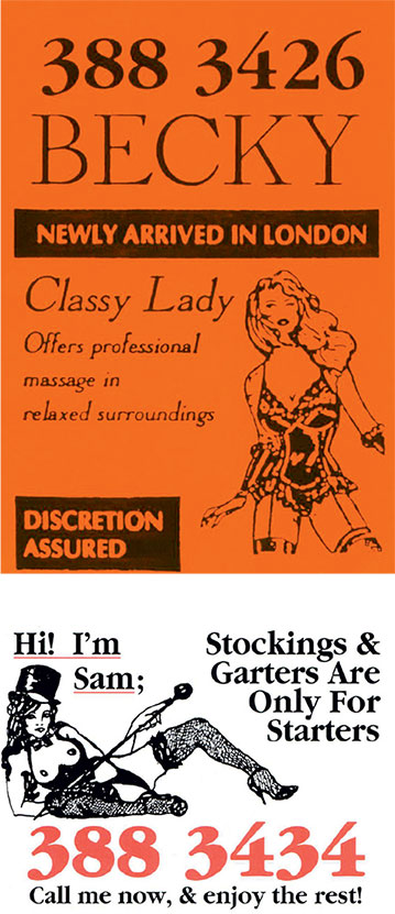 Сексуальная торговля стара, как сама цивилизация. И ровно столько, сколько люди покупали и продавали сексуальные услуги, власти пытались эту торговлю как-то регулировать: обычно – через криминализацию и карательные меры. На протяжении веков проституток наказывали штрафами, тюремным заключением, отлучением, ссылками, побоями и даже смертью. Большинство наказаний было связано с публичным унижением – считалось, что такие меры внушат людям желание вести себя лучше. Так, например, в XIV веке в Аугсбурге «василискам» (1508), которых заставали за работой в церковные праздники, отрезали носы. В 1713 году на острове Мэн Кэт Кинред, «известной шлюхе», которая «прижила трех незаконнорожденных детей», вынесли жестокий приговор: ее должны были «протащить за лодкой в море у Пил-Тауна… в рыночный день», дабы она послужила «примером для других». Несмотря на такие наказания, запреты сексуальной торговли успехом не увенчались. Криминализация загнала проституцию в темный уголовный мир и создала для женщин опасные условия работы. Каждая «трясогузка» (1553), работавшая в таких условиях, была вынуждена решать сложную дилемму: как остаться в безопасности и добыть клиентов, не привлекая при этом внимания закона. Эффективным способом решить эту дилемму была реклама. Одна из самых культовых и узнаваемых форм сексуальной рекламы – яркие визитки (tart cards), которыми некогда пестрели телефонные будки по всей Британии.