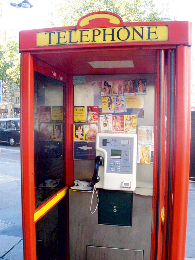 Карточки проституток в британской телефонной будке, 2004. К 2004 году такая реклама стала незаконной, но остается по-прежнему очень распространенной
