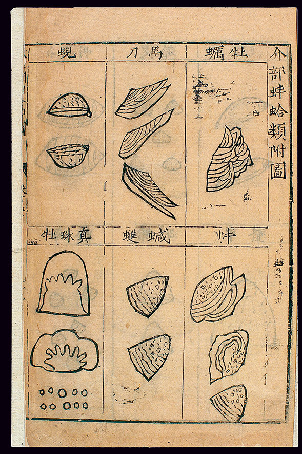 Шесть типов моллюсков: мюли (устрица), мадао (морской черенок), сиань (вонголе), бенг (пресноводная мидия), сянчжин (разновидность двустворчатого моллюска) и чженчжу (устрица-жемчужница) – из фармацевтической энциклопедии Ли Шичженя «Основы фармакологии», 1596