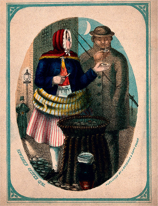 Юная девушка, продающая устриц на улице. Цветная литография XIX века выпущена компанией «Дж. Брайдон и сыновья»
