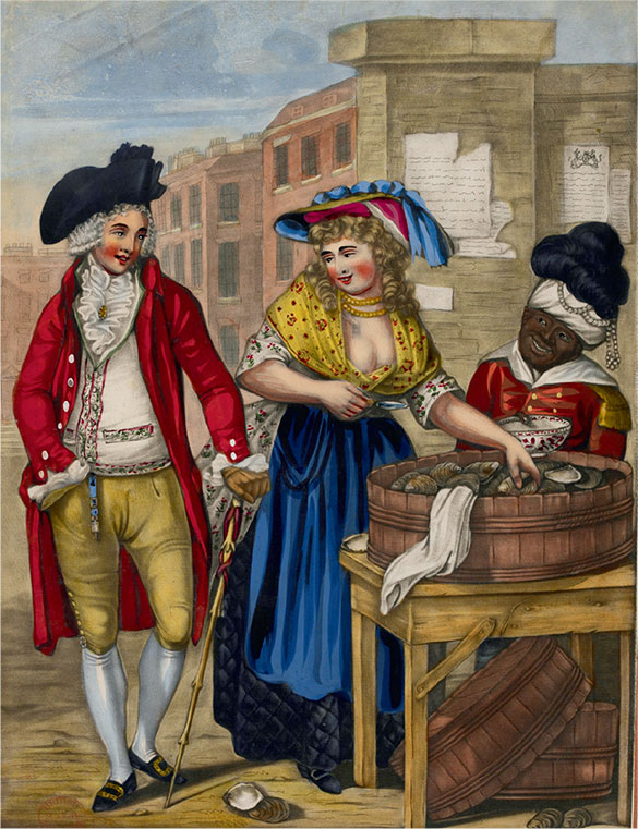 Молли Мэллоун, милая торговка устрицами, 1788. Молли предлагает свой товар молодому моднику, а тот поглаживает ее по заду, держа руку в кармане