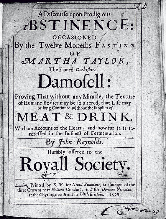 Трактат XVII века о преимуществах поста. Джон Рейнольдс, Невилл Симмонс и Дорман Ньюмен «Рассуждения об удивительном воздержании. Двенадцать месяцев поста Марты Тейлор, знаменитой дамочки из Дербишира. Доказательство того, что свойства человеческого тела без всяких чудес способны измениться так, что жизнь может быть долгой и продолжаться без мяса и питья одной лишь силой сердца, а также насколько это интересно для занятия ферментацией»